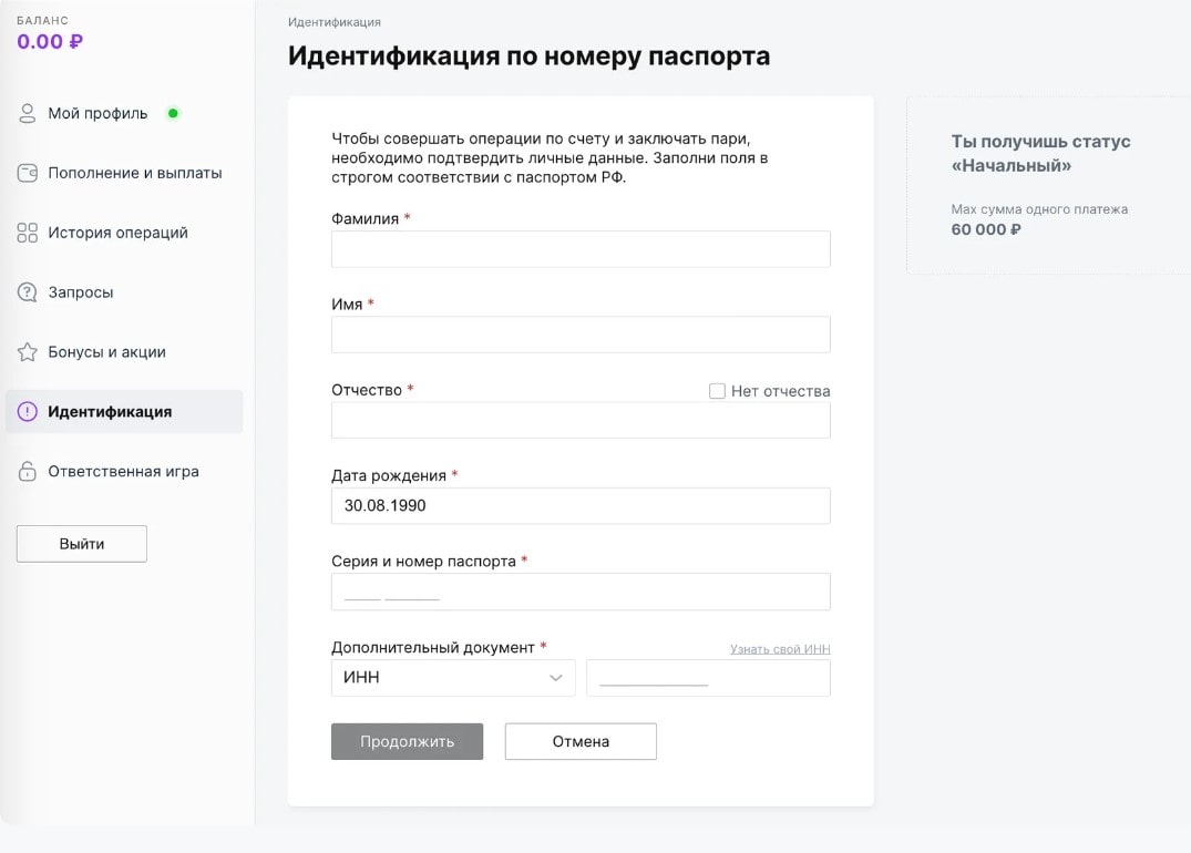 Процесс идентификации в БК PARI ru не завершится, если у нового клиента букмекера нет проверенного кошелька Первый ЦУПИС. В связи с этим, пользователям, которые не создали и не подтвердили личный кабинет на сайте Центра учета ставок в интернете, пройти проверку не удастся.